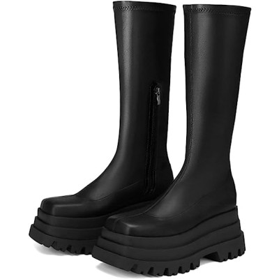 Chunky Platform Boots for Women Knee High Mid Calf Boots Block High Heeled Combat Boot