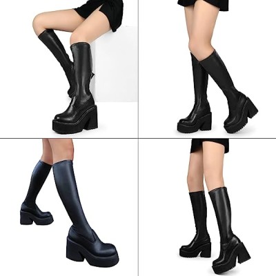 Black Platform Boots Round Toe Chunky High Heels Pull-on Stretch Leather Boots Goth Punk Platform Boots